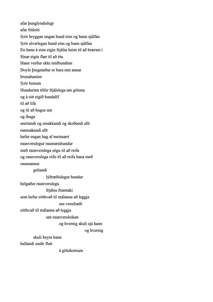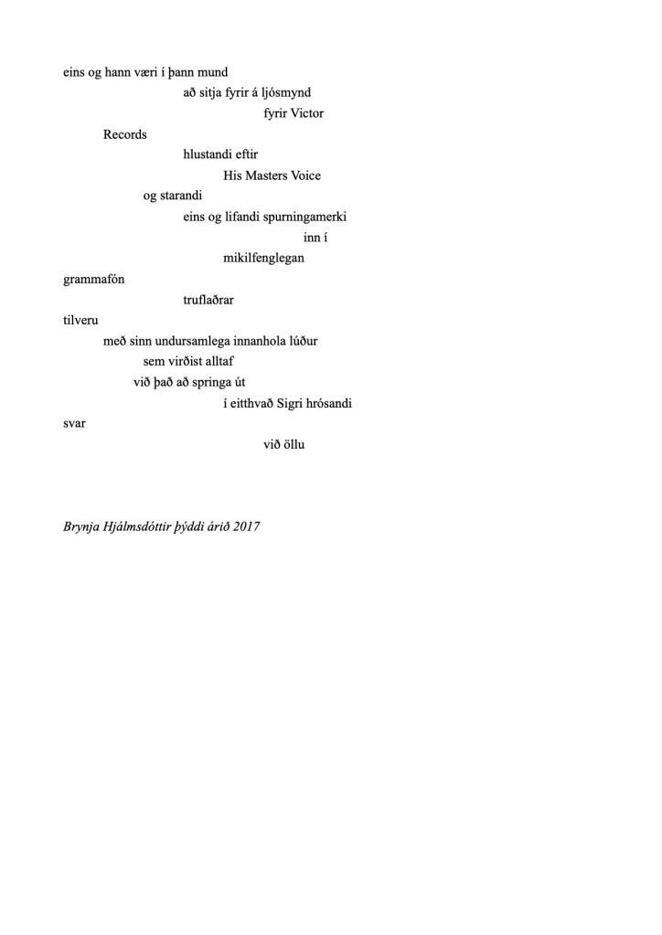 Þýðingin var gert fyrir hlaðvarpsseríuna Póetrí Gó, árið 2017. Hér má hlusta á þáttinn þar sem þýðingin var flutt.